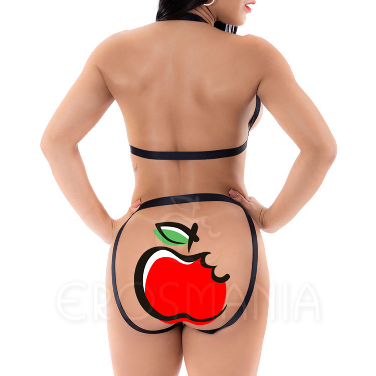 Erótico e provocante arreio feminino para fetiches sado, confeccionado em tiras elásticas. Um acessório indispensável para os prazerosos fetiches da dominação. Modelo body com a parte de baixo totalmente aberta expondo suas virtudes. Detalhes com argolas cromadas.