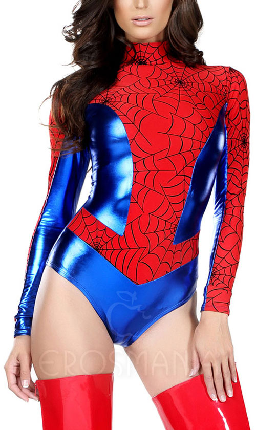 Sensual fantasia de mulher aranha, confeccionada em tecido vermelho e azul metalizado com elastano. Com desenhos no formato de teias de aranha. Composta por um body manga longa com zíper na parte de trás.