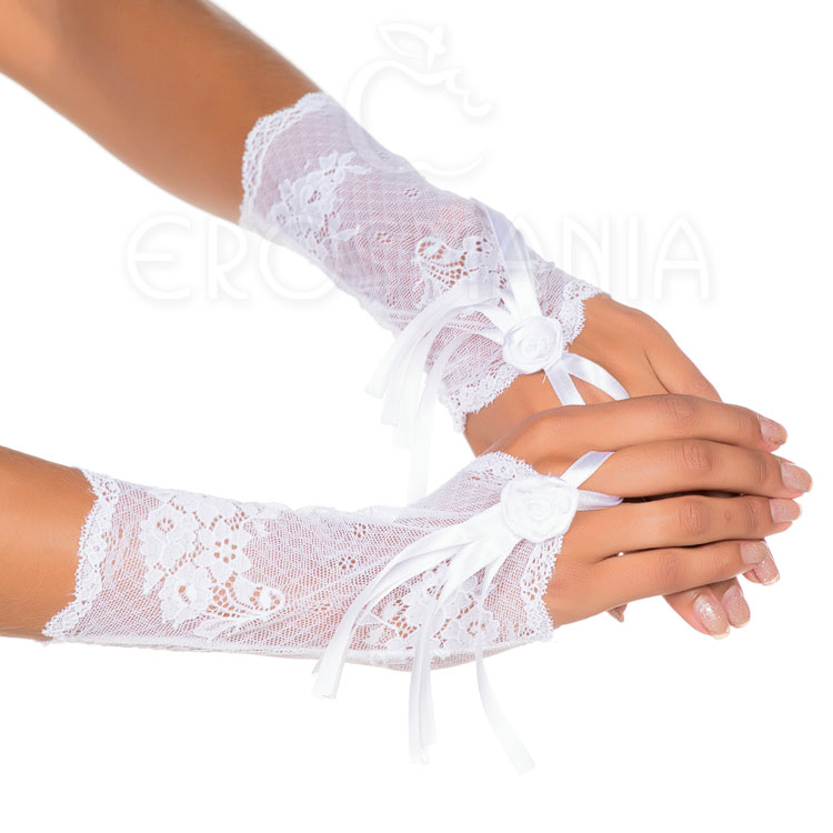 Belíssimo a atraente par de luvas de dedinho em renda com elastano. Detalhe com rosa e fitas de cetim. A valorização da sua sensualidade.