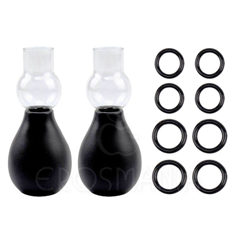 Como usar: Coloque um dos anéis, no tamanho desejado, na base da bomba e coloque-a sobre o mamilo para sugá-lo. Aperte a bomba até chegar ao tamanho desejado do mamilo e em seguida deslize o anel até a base deste para mantê-lo ereto. Repita o processo no outro mamilo.