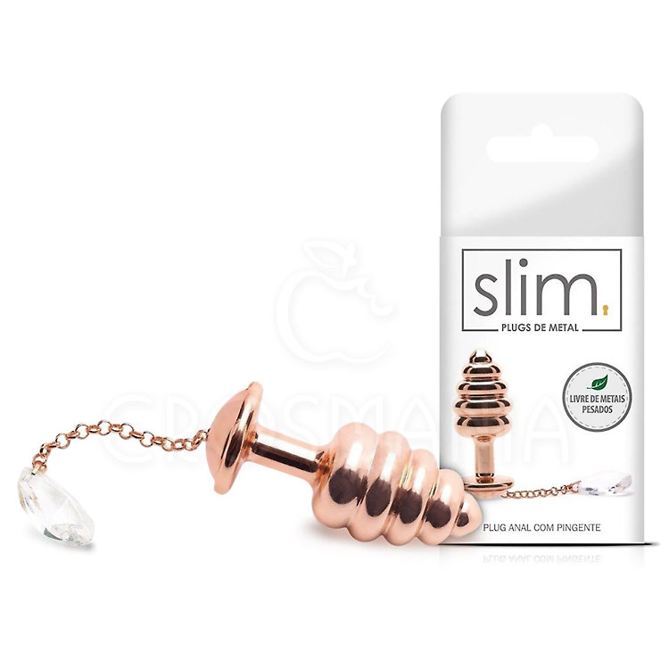 Plug anal de metal rose, super deslizante com anéis em relevo. Com pingente incolor, pendurado por correntinhas que garantem um visual diferenciado e elegante. Requinte e prazer aliados em um só produto.