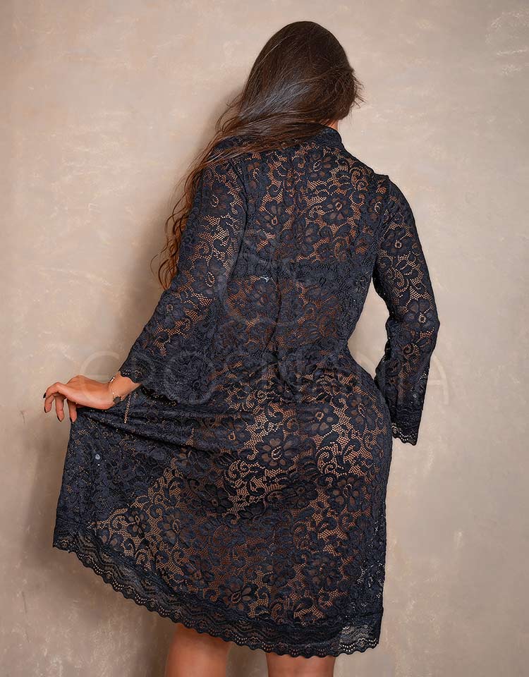 Este robe em rendão foi criado para quem aprecia o equilíbrio entre delicadeza e sofisticação. Sua transparência sutil revela o corpo na medida certa, criando um visual sedutor e elegante. O tecido leve com elastano proporciona conforto e um caimento impecável, acompanhando os movimentos com suavidade.