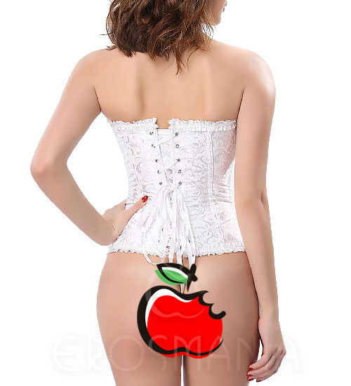 Belíssimo corselet tomara-que-caia, em tecido brocado com lindos desenhos acetinados. Possui ajuste trançado nas costas e prático fecho de zíper na parte da frente que dão um visual de alto luxo e sensualidade. Possui barbatanas em toda volta que firmam e valorizam seus seios e destacam suas curvas. Acabamento na barra e no busto em viés de cetim plissado e fita dupla no busto, fechando em um grande laço. Acompanha calcinha fio dental no mesmo tecido.