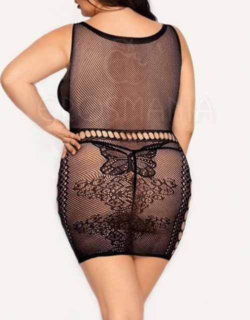 Erótica e sensual camisola confeccionada em poliéster com elastano, ajustando-se ao corpo, valorizando os incríveis detalhes vazados. Decote super provocante nos seios e linda trama arrastão com detalhe na frente de borboleta e flores.
